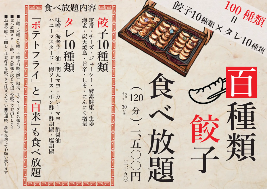 ・食べ放題スタート時にお客様の人数に応じて指定の餃子を提供いたします