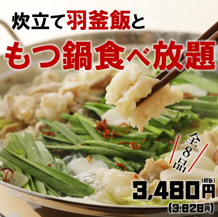 炊立て羽釜飯ともつ鍋食べ放題 全8品